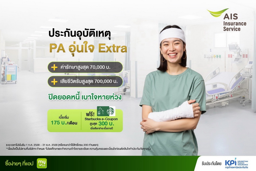 แผนประกันอุบัติเหตุ “PA อุ่นใจ Extra” พร้อมมอบความอุ่นใจแบบ Extra ด้วยเบี้ยเริ่มต้นเพียง 175 บาท ลูกค้าที่สนใจสามารถคลิกซื้อได้ที่ แอปพลิเคชัน myAIS ตั้งแต่วันที่ 1 กรกฎาคม ถึง 31 ธันวาคม 2568 เป็นต้นไป