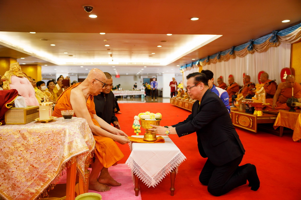 สมเด็จพระพุฒาจารย์ กรรมการมหาเถรสมาคม ประธานสมัชชามหาคณิสสรคณะสงฆ์ฝ่ายมหานิกาย เจ้าคณะใหญ่หนตะวันออก และเจ้าอาวาสวัดไตรมิตรวิทยารามวรวิหาร เป็นประธานสงฆ์ พร้อมพระภิกษุสงฆ์ 9 รูป เจริญพระพุทธมนต์และรับเครื่องจตุปัจจัยไทยธรรม รวมทั้งได้รับถวายภัตตาหารเพลจากผู้ร่วมงาน