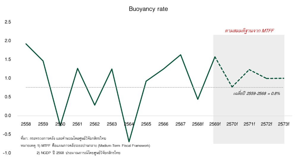 O ประสิทธิภาพการจัดเก็บรายได้ต้องขยายตัวเร็วกว่าการเติบโตทางเศรษฐกิจ หรือ Buoyancy rate มีค่ามากกว่า 1 ซึ่งในช่วง 10 ปีที่ผ่านมา (2558-2567) มีค่าเฉลี่ยอยู่ที่ 0.8 สะท้อนการจัดเก็บรายได้รัฐบาลเติบโตช้ากว่าเศรษฐกิจ กล่าวคือ เมื่อเศรษฐกิจเติบโตได้ 1% รัฐบาลเพิ่มรายได้ ได้เพียง 0.8%