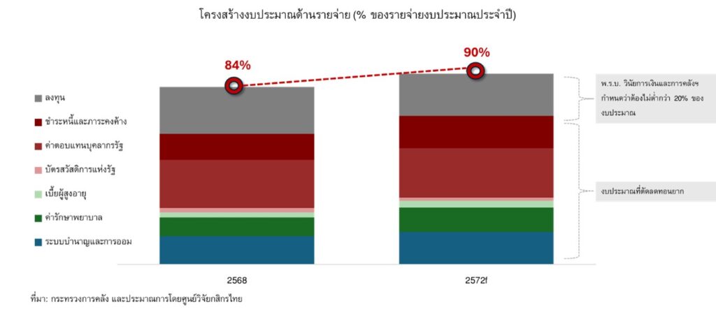 O การปรับลดงบประมาณด้านรายจ่ายมีข้อจำกัดค่อนข้างมาก เนื่องจากกว่า 90% เป็นรายจ่ายประจำที่ปรับลดยาก ได้แก่ รายจ่ายสวัสดิการ ค่าจ้างบุคลากรภาครัฐ หนี้และภาระคงค้าง และรายจ่ายลงทุนยังถูกกำหนดให้ต้องจัดสรรไม่ต่ำกว่า 20% ของงบประมาณรายจ่ายประจำปี (รูปที่ 3) ส่งผลให้พื้นที่สำหรับการปรับลดในระยะสั้นมีจำกัด นอกจากจะมีการปฏิรูปรายจ่ายเชิงโครงสร้างหรือปรับลดงบประมาณในหมวดที่มีขนาดใหญ่