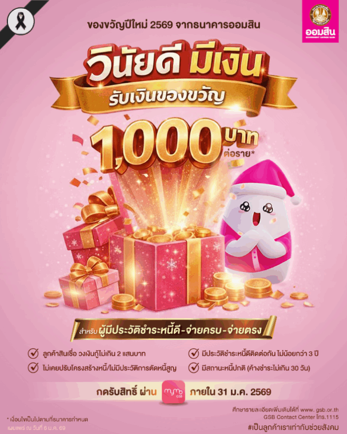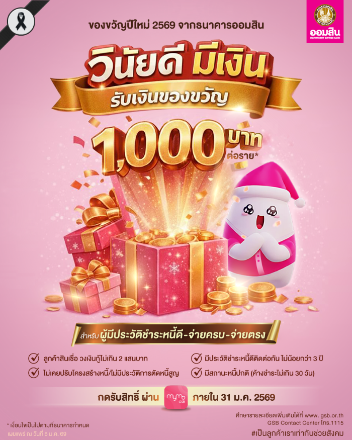 ธนาคารออมสิน ร่วมส่งมอบความสุขในช่วงเทศกาลต้อนรับปีใหม่ 2569 จัดเตรียมของขวัญ เพื่อส่งความสุขให้ประชาชน ภายใต้โครงการ “วินัยดี มีเงิน” ให้แก่ลูกค้าธนาคารด้วยการมอบเงินของขวัญพิเศษรายละ 1,000 บาท ให้แก่ลูกหนี้ที่ใช้บริการสินเชื่อวงเงินกู้ไม่เกิน 200,000 บาท มีประวัติชำระหนี้ดีติดต่อกันไม่น้อยกว่า 3 ปี ไม่เคยปรับโครงสร้างหนี้/ไม่มีประวัติการตัดหนี้สูญ และมีสถานะหนี้ปกติ (ค้างชำระไม่เกิน 30 วัน)