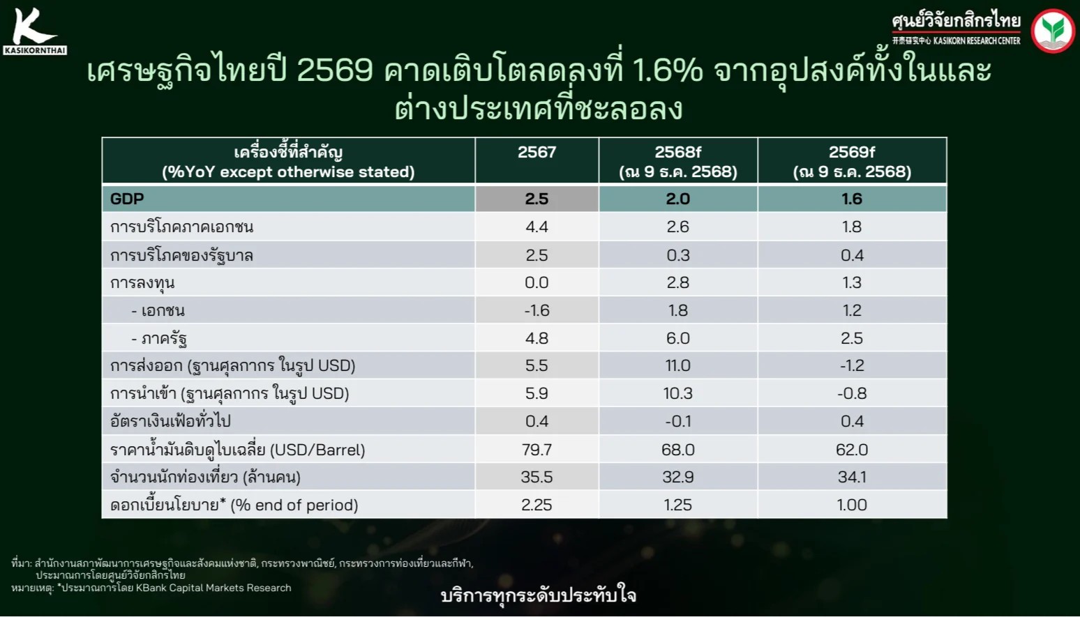 ศูนย์วิจัยกสิกรไทยคาดปี 2569 เศรษฐกิจไทยโตชะลอลงมาที่ 1.6% จากการส่งออกที่หดตัวจากผลกระทบจากภาษีทรัมป์   การท่องเที่ยวที่อาจฟื้นตัวไม่เต็มที่  และการเมืองในช่วงเปลี่ยนผ่านการเลือกตั้ง อาจกระทบต่อนโยบายงบลงทุนภาครัฐและการเบิกจ่าย  ขณะที่ภาคการผลิตที่ลดลงจากคำสั่งซื้อทั้งในและต่างประเทศชะลอตัว เป็นโจทย์ท้าทายที่ภาครัฐต้องแก้ปัญหาระยะกลาง-ยาว เพื่อปรับให้เข้ากับเทรนด์โลก