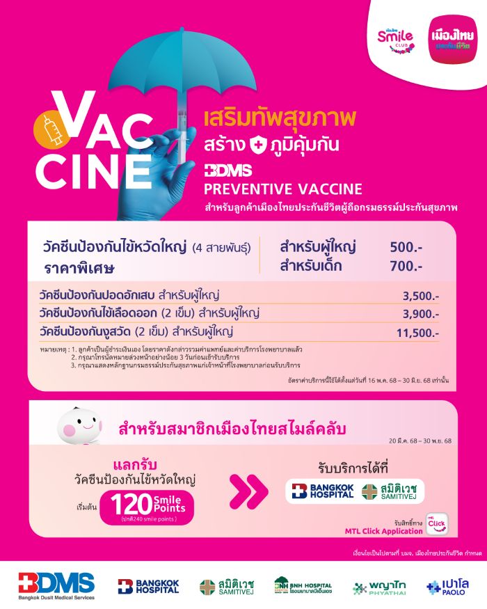 นอกจากนี้  เมืองไทยประกันชีวิตยังได้ร่วมแคมเปญ “BDMS PREVENTIVE VACCINE”  มอบสิทธิพิเศษสำหรับผู้ถือกรมธรรม์ประกันสุขภาพ รับวัคซีนในราคาสุดพิเศษ (รวมค่าแพทย์) ครอบคลุม 4 กลุ่มโรคหลัก ได้แก่ วัคซีนป้องกันโรคไข้หวัดใหญ่ 4 สายพันธุ์ สำหรับผู้ใหญ่ราคา 500 บาท และเด็ก ราคา 700 บาท วัคซีนป้องกันโรคปอดอักเสบ   สำหรับผู้ใหญ่ ราคา 3,500 บาท วัคซีนป้องกันโรคไข้เลือดออกสำหรับผู้ใหญ่           (2 เข็ม) รวมราคา 3,900 บาท และวัคซีนป้องกันโรคงูสวัดสำหรับผู้ใหญ่ (2 เข็ม) รวมราคา 11,500 บาท    โดยผู้ถือกรมธรรม์ประกันสุขภาพของเมืองไทยประกันชีวิต สามารถแสดงหลักฐานเพื่อเข้ารับบริการได้        ณ โรงพยาบาลในเครือ BDMS  ทั่วประเทศ ตั้งแต่วันที่ 16 พฤษภาคม 2568 – 30 มิถุนายน 2568  โดยผู้ที่สนใจสามารถสอบถามรายละเอียดเพิ่มเติม ได้ที่โรงพยาบาลในเครือ BDMS ทั่วประเทศ