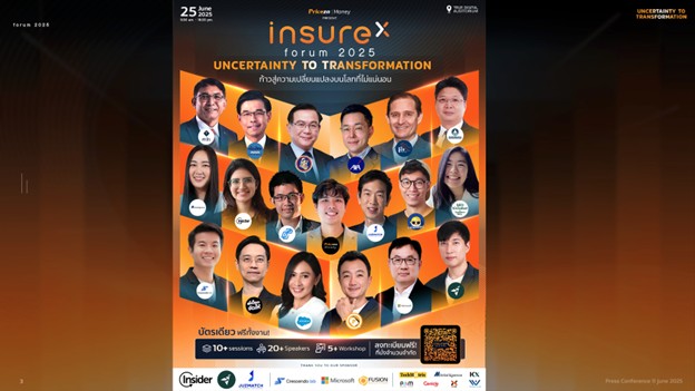 เป็นที่มาของงาน InsureX FORUM 2025 : Uncertainty to Transformation ‘ก้าวสู่ความเปลี่ยนแปลงบนโลกที่ไม่แน่นอน’ งานเพื่อคนในวงการประกันภัยที่จะนำทุกคนไปสู่การรู้ทันสถานการณ์ของโลกที่เปลี่ยนไปและปรับตัวได้ทันก่อนที่ปัญหาต่างๆจะเกิดขึ้นกับธุรกิจประกันภัย