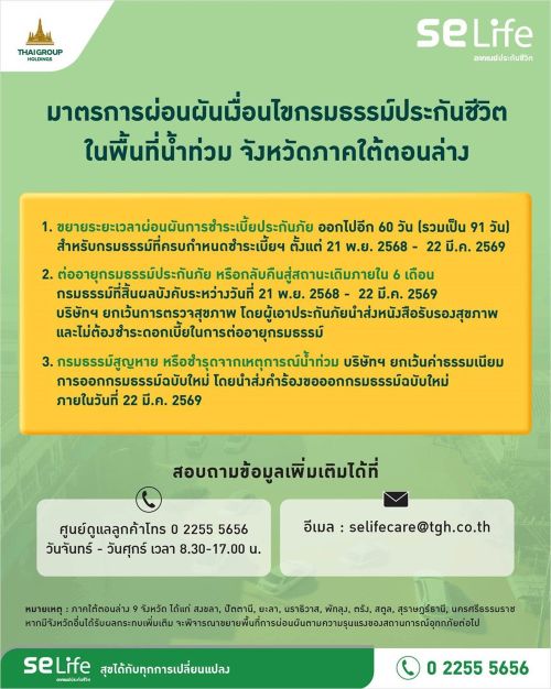 โดยลูกค้าสามารถสอบถามข้อมูลเพิ่มเติมได้ที่ ศูนย์ดูแลลูกค้า โทร. 0 2255 5656 ในวันจันทร์-วันศุกร์ เวลา 08.30-17.00 น. หรืออีเมล selifecare@tgh.co.th นอกจากนี้ คณะผู้บริหารและพนักงาน SE Life อาคเนย์ประกันชีวิต ได้ร่วมใจกันบรรจุถุงยังชีพเพื่อช่วยบรรเทาความเดือดร้อนและส่งมอบกำลังใจแก่ประชาชนในพื้นที่ภาคใต้ให้สามารถก้าวผ่านสถานการณ์ครั้งนี้และกลับคืนสู่ภาวะปกติโดยเร็ว