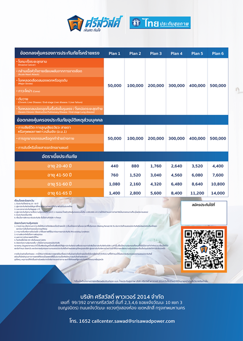 สำหรับผลิตภัณฑ์ “SAWAD CIPA EXTRA” เป็นประกันภัยคุ้มครองโรคร้ายแรงและอุบัติเหตุ มีให้เลือกทั้งหมด 6 แผน วงเงินคุ้มครองตั้งแต่ 50,000–500,000 บาท โดยมีอัตราเบี้ยเริ่มต้นเพียง 440 บาทต่อปี ผู้สนใจสามารถติดต่อ ผ่านทาง SAWAD ได้ที่ โทร. 1652